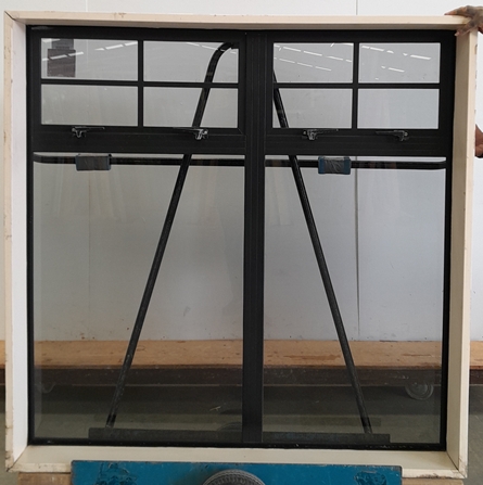 Black aluminium twin awning window with glazing bars across on top sashes